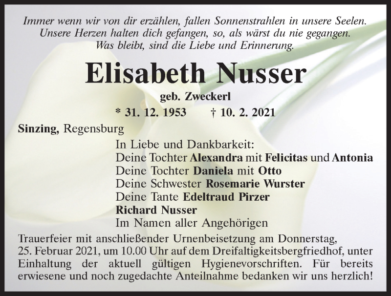 Hier finden Sie alle Traueranzeigen aus der Zeitung, die bisher für Elisabeth Nusser erschienen sind.