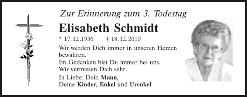 Hier finden Sie alle Traueranzeigen aus der Zeitung, die bisher für Elisabeth Schmidt erschienen sind.