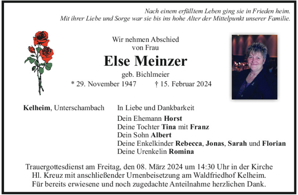 Hier finden Sie alle Traueranzeigen aus der Zeitung, die bisher für Else Meinzer erschienen sind.