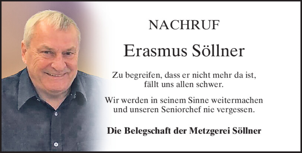 Hier finden Sie alle Traueranzeigen aus der Zeitung, die bisher für Erasmus Söllner erschienen sind.