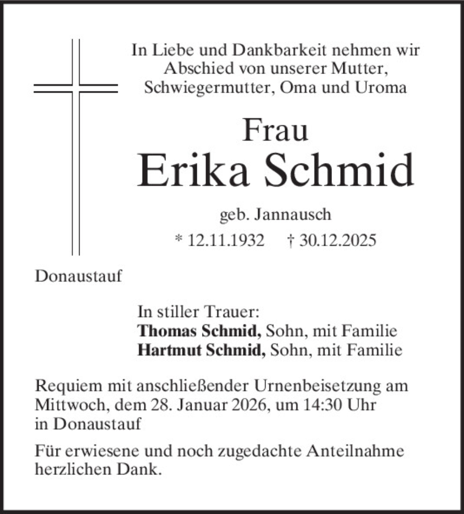 Hier finden Sie alle Traueranzeigen aus der Zeitung, die bisher für Erika Schmid erschienen sind.
