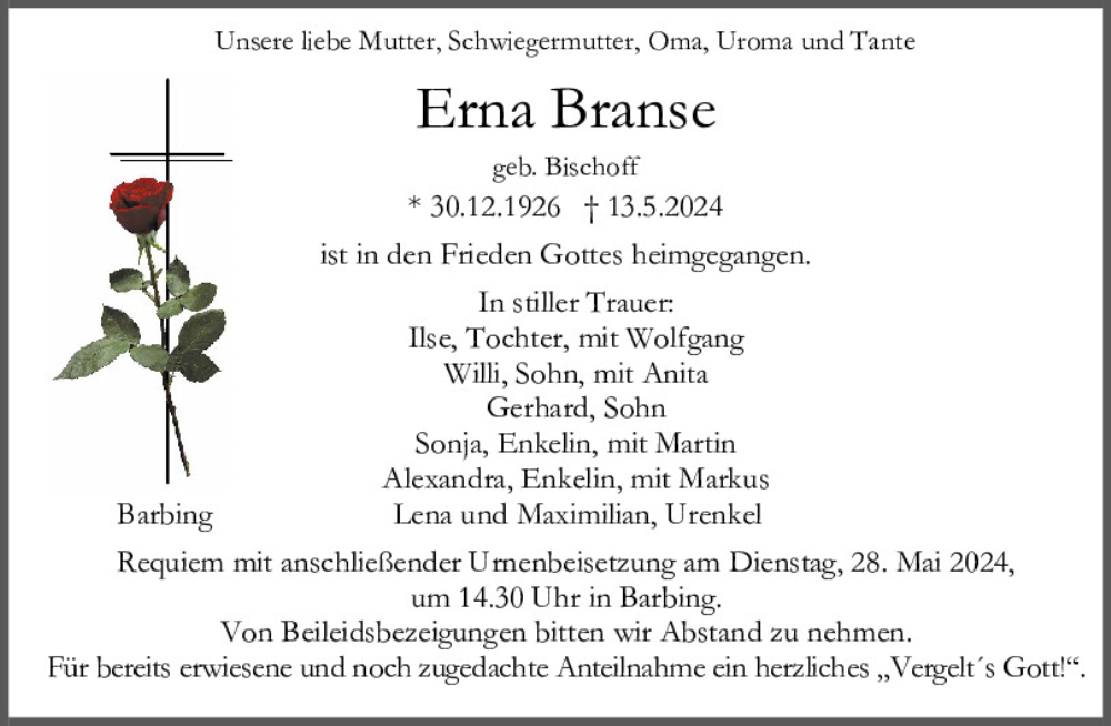 Hier finden Sie alle Traueranzeigen aus der Zeitung, die bisher für Erna Branse erschienen sind.