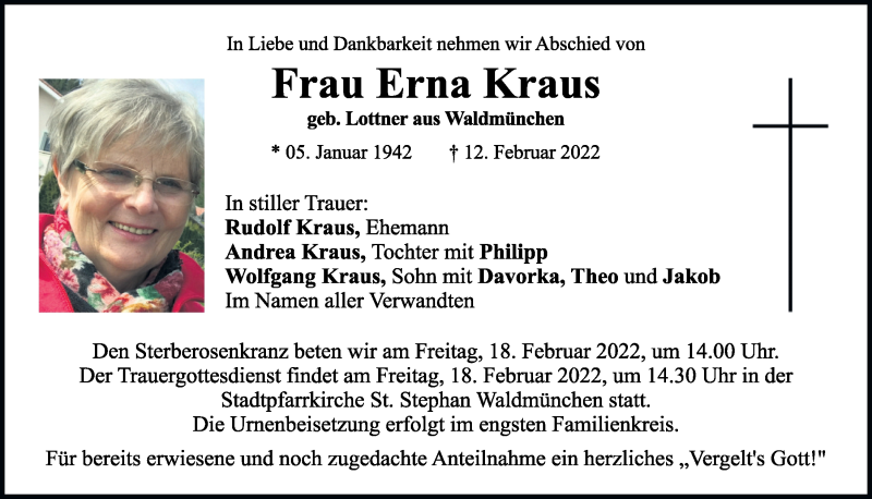 Hier finden Sie alle Traueranzeigen aus der Zeitung, die bisher für Erna Kraus erschienen sind.
