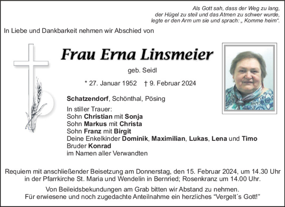 Hier finden Sie alle Traueranzeigen aus der Zeitung, die bisher für Erna Linsmeier erschienen sind.