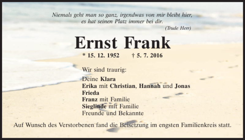 Hier finden Sie alle Traueranzeigen aus der Zeitung, die bisher für Ernst Frank erschienen sind.