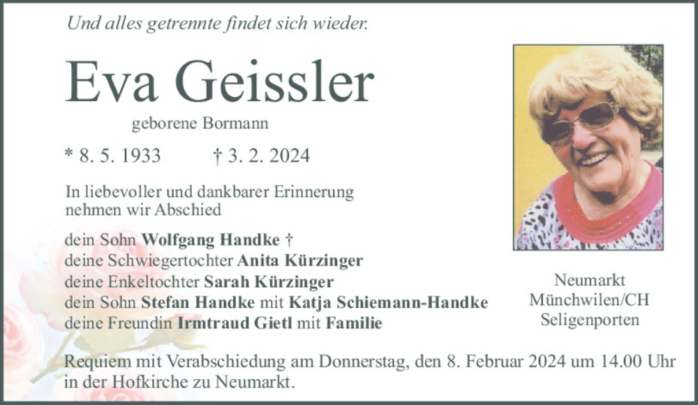 Hier finden Sie alle Traueranzeigen aus der Zeitung, die bisher für Eva Geissler erschienen sind.