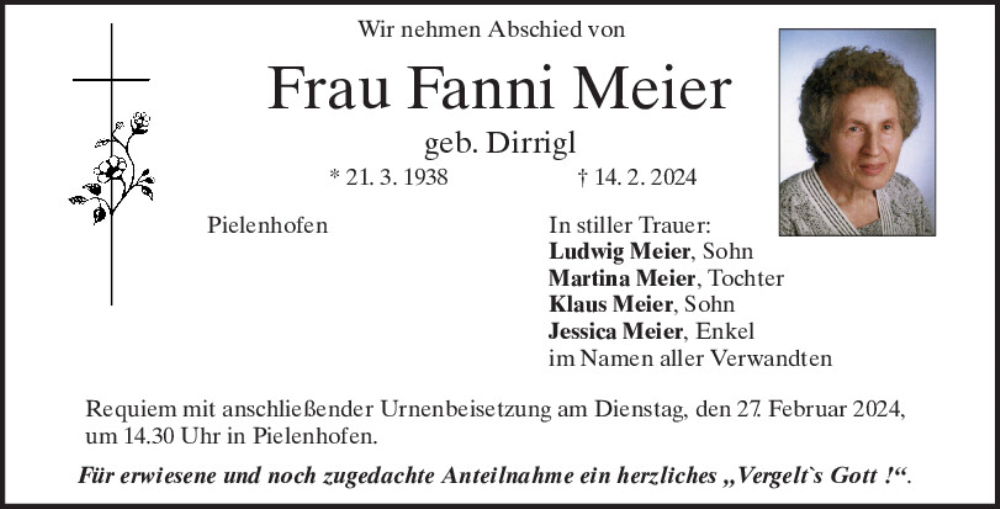 Hier finden Sie alle Traueranzeigen aus der Zeitung, die bisher für Fanni Meier erschienen sind.