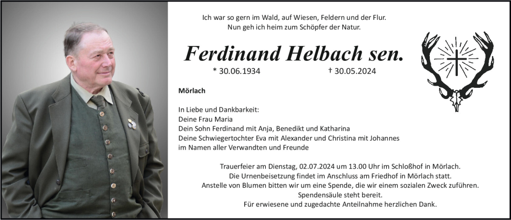 Hier finden Sie alle Traueranzeigen aus der Zeitung, die bisher für Ferdinand Helbach erschienen sind.