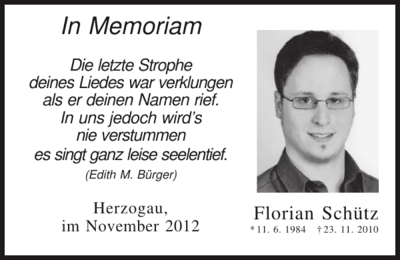 Hier finden Sie alle Traueranzeigen aus der Zeitung, die bisher für Florian Schütz erschienen sind.