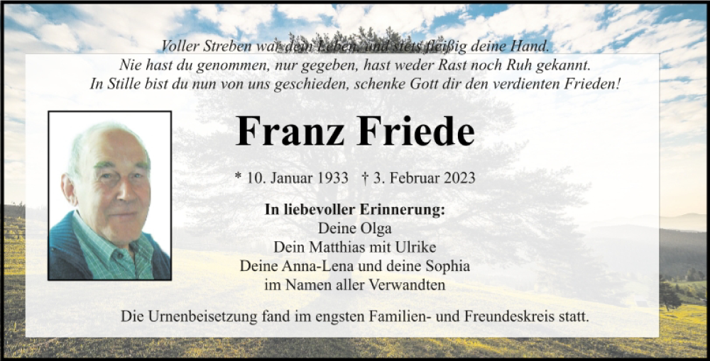 Hier finden Sie alle Traueranzeigen aus der Zeitung, die bisher für Franz Friede erschienen sind.