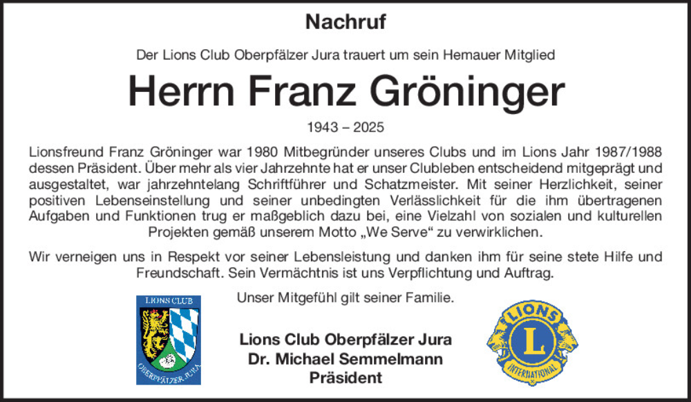 Hier finden Sie alle Traueranzeigen aus der Zeitung, die bisher für Franz Gröninger erschienen sind.
