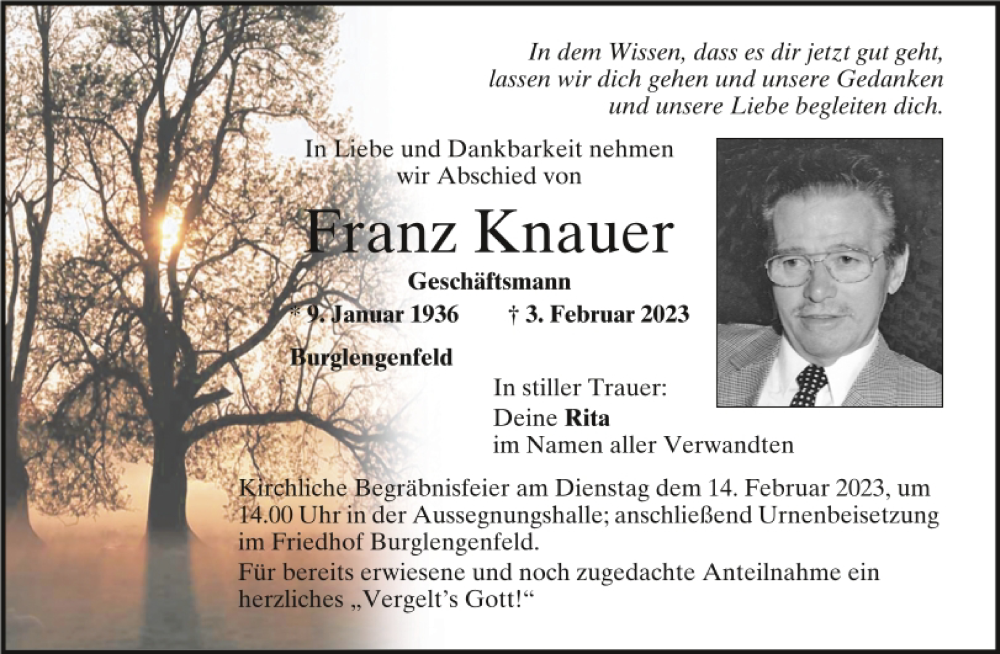 Hier finden Sie alle Traueranzeigen aus der Zeitung, die bisher für Franz Knauer erschienen sind.