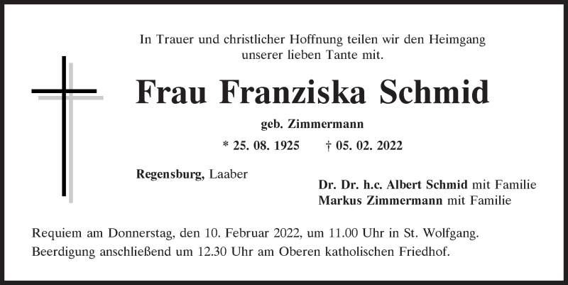 Hier finden Sie alle Traueranzeigen aus der Zeitung, die bisher für Franziska Schmid erschienen sind.