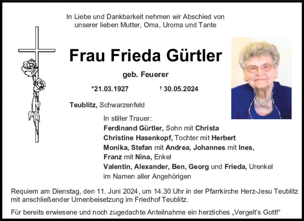 Hier finden Sie alle Traueranzeigen aus der Zeitung, die bisher für Frieda Gürtler erschienen sind.