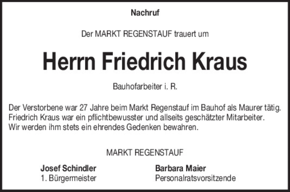 Hier finden Sie alle Traueranzeigen aus der Zeitung, die bisher für Friedrich Kraus erschienen sind.