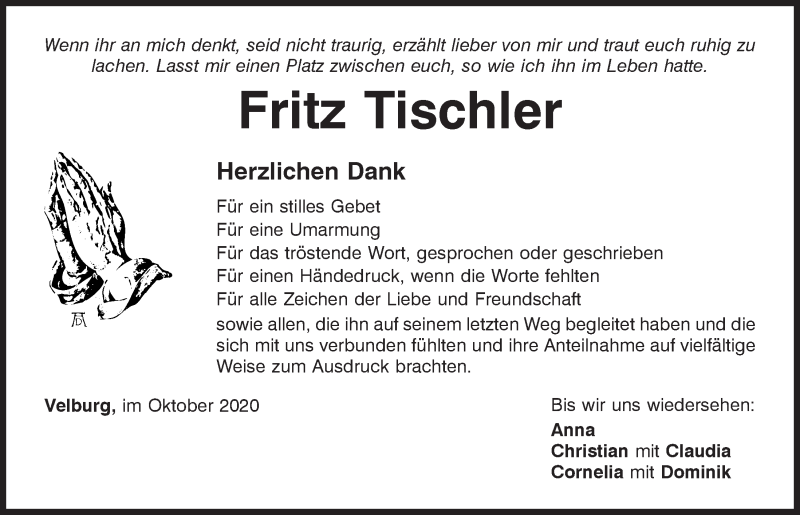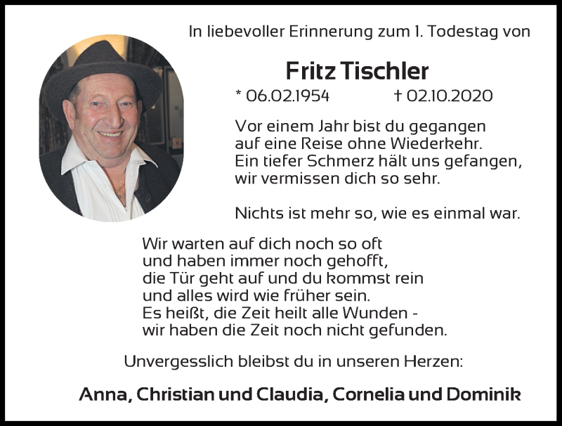 Hier finden Sie alle Traueranzeigen aus der Zeitung, die bisher für Fritz Tischler erschienen sind.