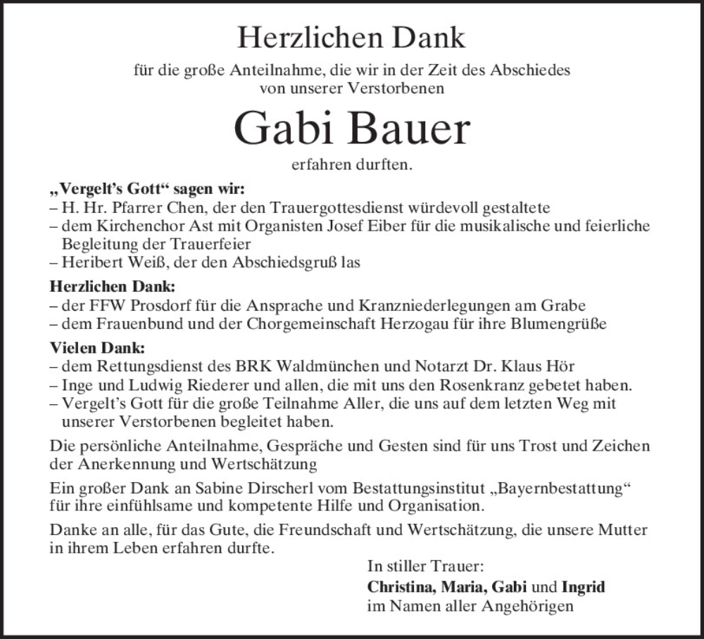 Hier finden Sie alle Traueranzeigen aus der Zeitung, die bisher für Gabi Bauer erschienen sind.