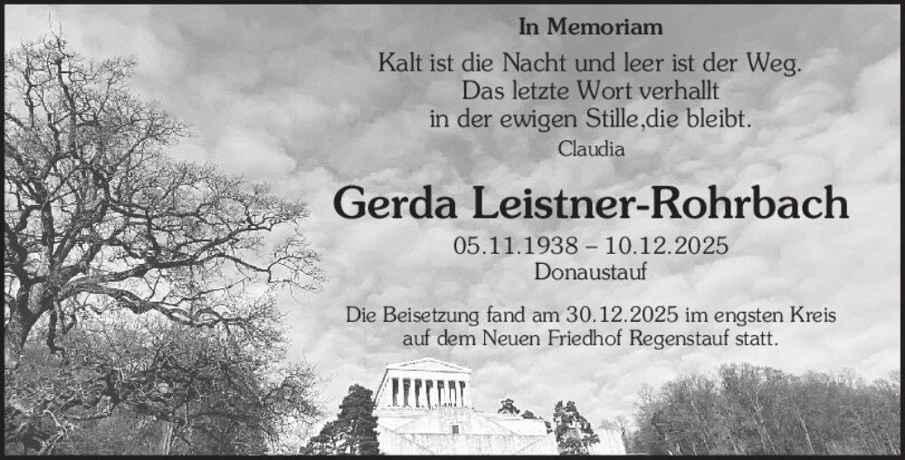 Hier finden Sie alle Traueranzeigen aus der Zeitung, die bisher für Gerda Leistner-Rohrbach erschienen sind.