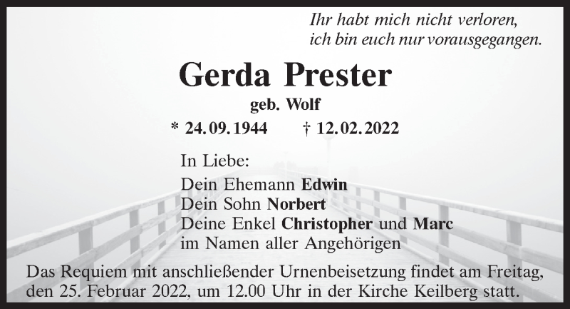 Hier finden Sie alle Traueranzeigen aus der Zeitung, die bisher für Gerda Prester erschienen sind.
