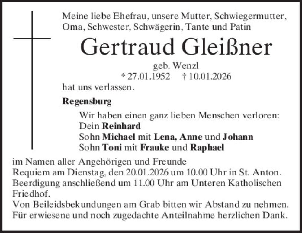 Hier finden Sie alle Traueranzeigen aus der Zeitung, die bisher für Gertraud Gleißner erschienen sind.