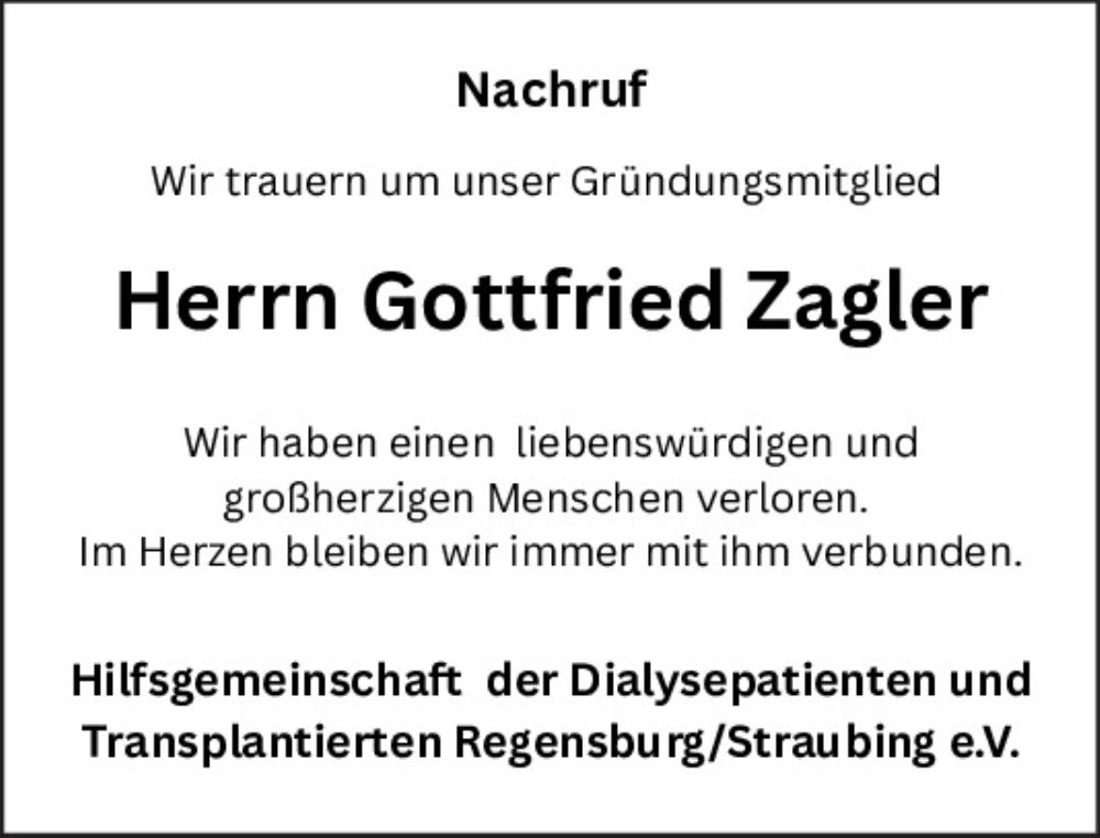 Hier finden Sie alle Traueranzeigen aus der Zeitung, die bisher für Gottfried Zagler erschienen sind.