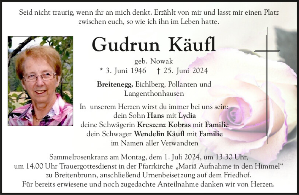 Hier finden Sie alle Traueranzeigen aus der Zeitung, die bisher für Gudrun Käufl erschienen sind.