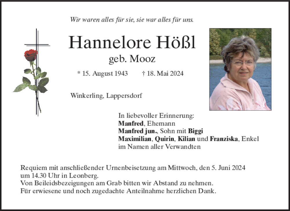 Hier finden Sie alle Traueranzeigen aus der Zeitung, die bisher für Hannelore Hößl erschienen sind.