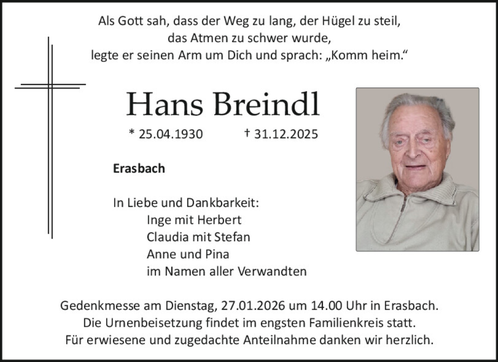 Hier finden Sie alle Traueranzeigen aus der Zeitung, die bisher für Hans Breindl erschienen sind.