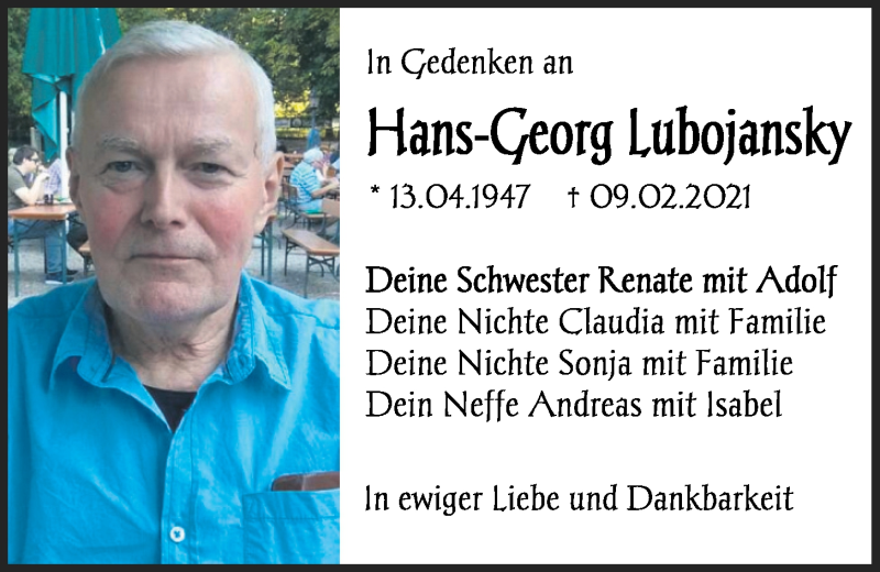 Hier finden Sie alle Traueranzeigen aus der Zeitung, die bisher für Hans-Georg Lubojansky erschienen sind.