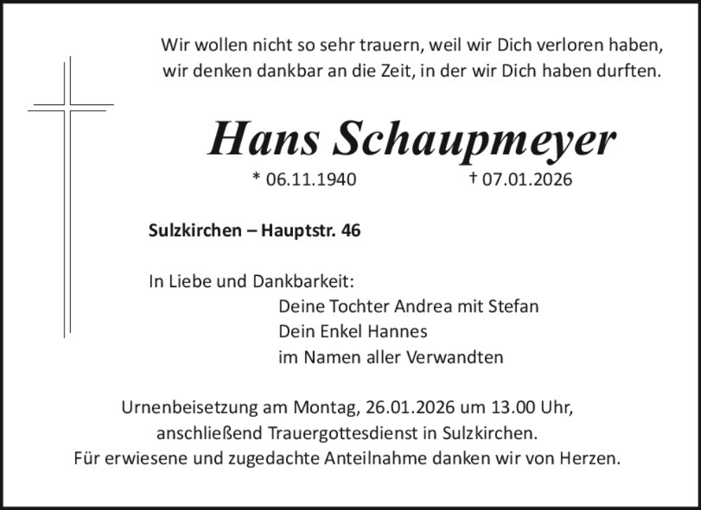 Hier finden Sie alle Traueranzeigen aus der Zeitung, die bisher für Hans Schaupmeyer erschienen sind.
