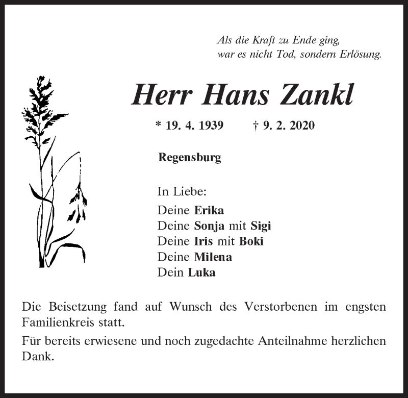 Hier finden Sie alle Traueranzeigen aus der Zeitung, die bisher für Hans Zankl erschienen sind.