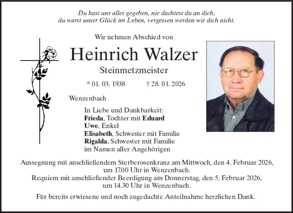 Hier finden Sie alle Traueranzeigen aus der Zeitung, die bisher für Heinrich Walzer erschienen sind.