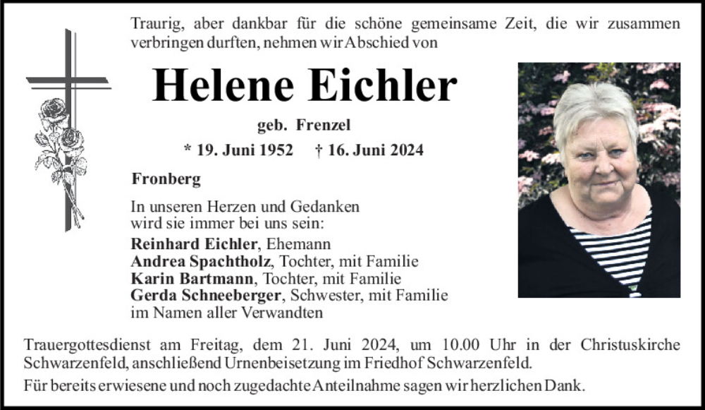Hier finden Sie alle Traueranzeigen aus der Zeitung, die bisher für Helene Eichler erschienen sind.