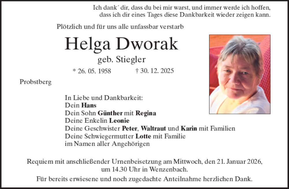 Hier finden Sie alle Traueranzeigen aus der Zeitung, die bisher für Helga Dworak erschienen sind.