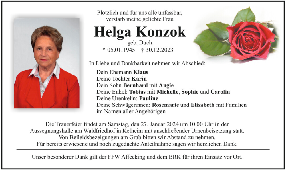 Hier finden Sie alle Traueranzeigen aus der Zeitung, die bisher für Helga Konzok erschienen sind.