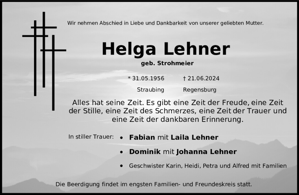 Hier finden Sie alle Traueranzeigen aus der Zeitung, die bisher für Helga Lehner erschienen sind.