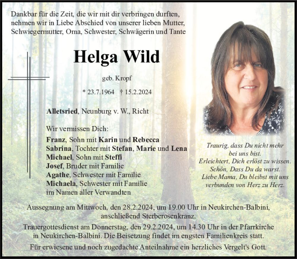 Hier finden Sie alle Traueranzeigen aus der Zeitung, die bisher für Helga Wild erschienen sind.