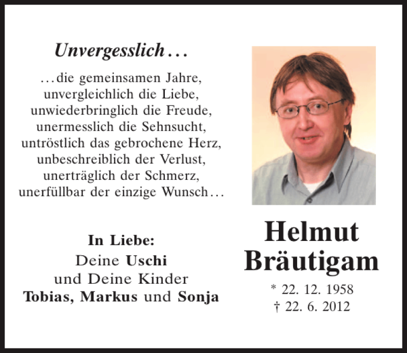 Hier finden Sie alle Traueranzeigen aus der Zeitung, die bisher für Helmut Bräutigam erschienen sind.