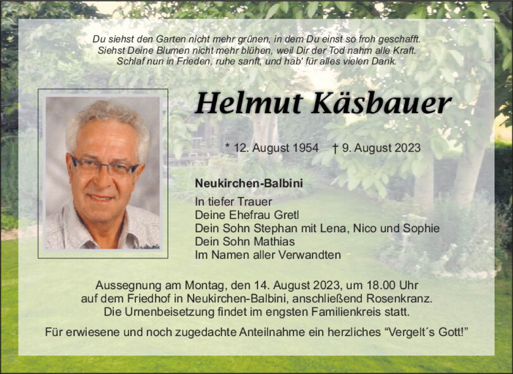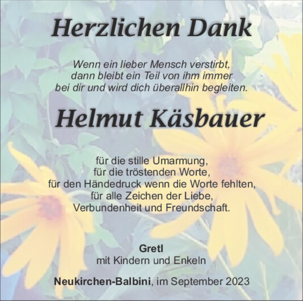 Hier finden Sie alle Traueranzeigen aus der Zeitung, die bisher für Helmut Käsbauer erschienen sind.