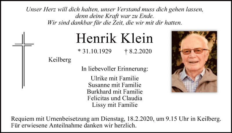 Hier finden Sie alle Traueranzeigen aus der Zeitung, die bisher für Henrik Klein erschienen sind.