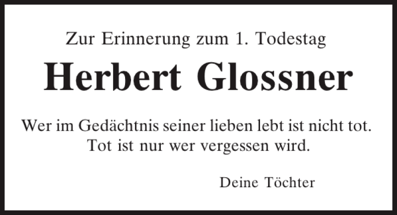 Hier finden Sie alle Traueranzeigen aus der Zeitung, die bisher für Herbert Glossner erschienen sind.