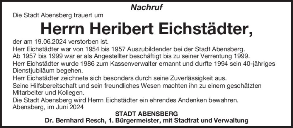 Hier finden Sie alle Traueranzeigen aus der Zeitung, die bisher für Heribert Eichstädter erschienen sind.