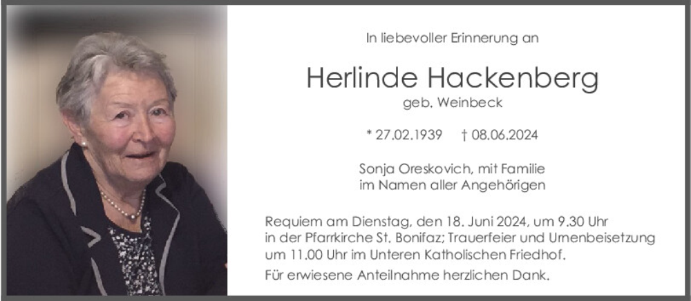 Hier finden Sie alle Traueranzeigen aus der Zeitung, die bisher für Herlinde Hackenberg erschienen sind.