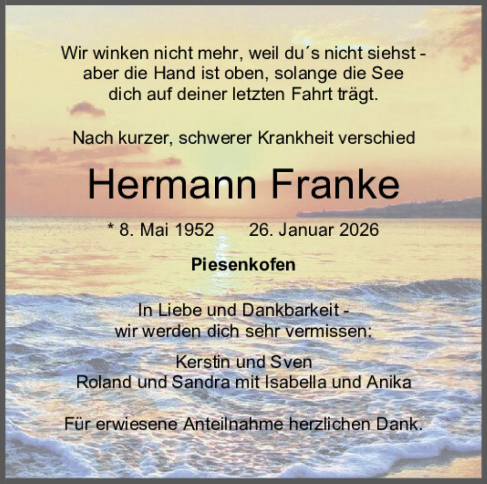 Hier finden Sie alle Traueranzeigen aus der Zeitung, die bisher für Hermann Franke erschienen sind.