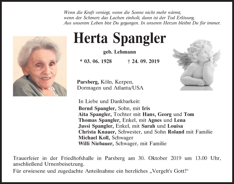 Hier finden Sie alle Traueranzeigen aus der Zeitung, die bisher für Herta Spangler erschienen sind.