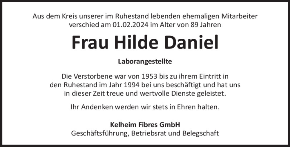 Hier finden Sie alle Traueranzeigen aus der Zeitung, die bisher für Hilde Daniel erschienen sind.