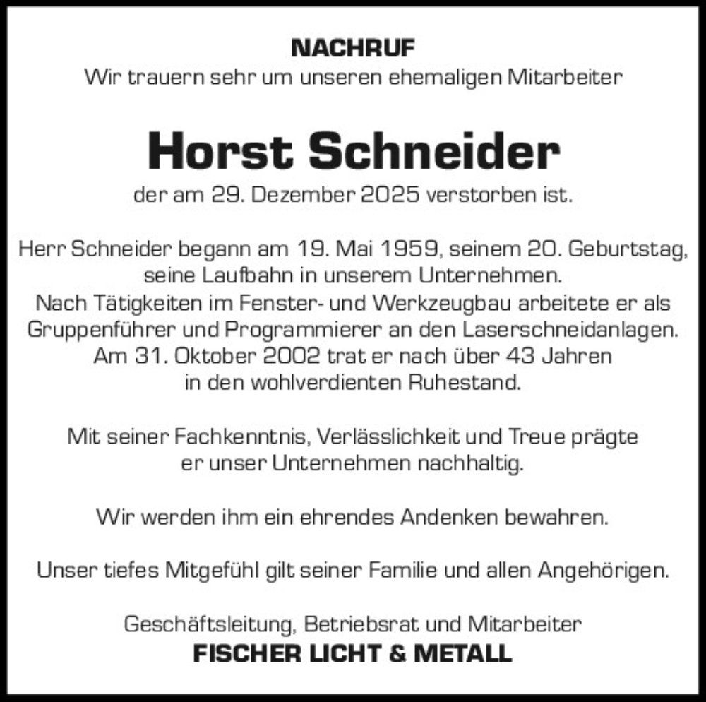 Hier finden Sie alle Traueranzeigen aus der Zeitung, die bisher für Horst Schneider erschienen sind.