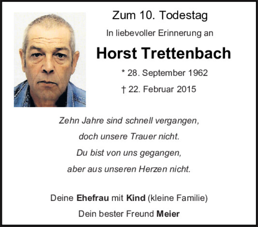 Hier finden Sie alle Traueranzeigen aus der Zeitung, die bisher für Horst Trettenbach erschienen sind.