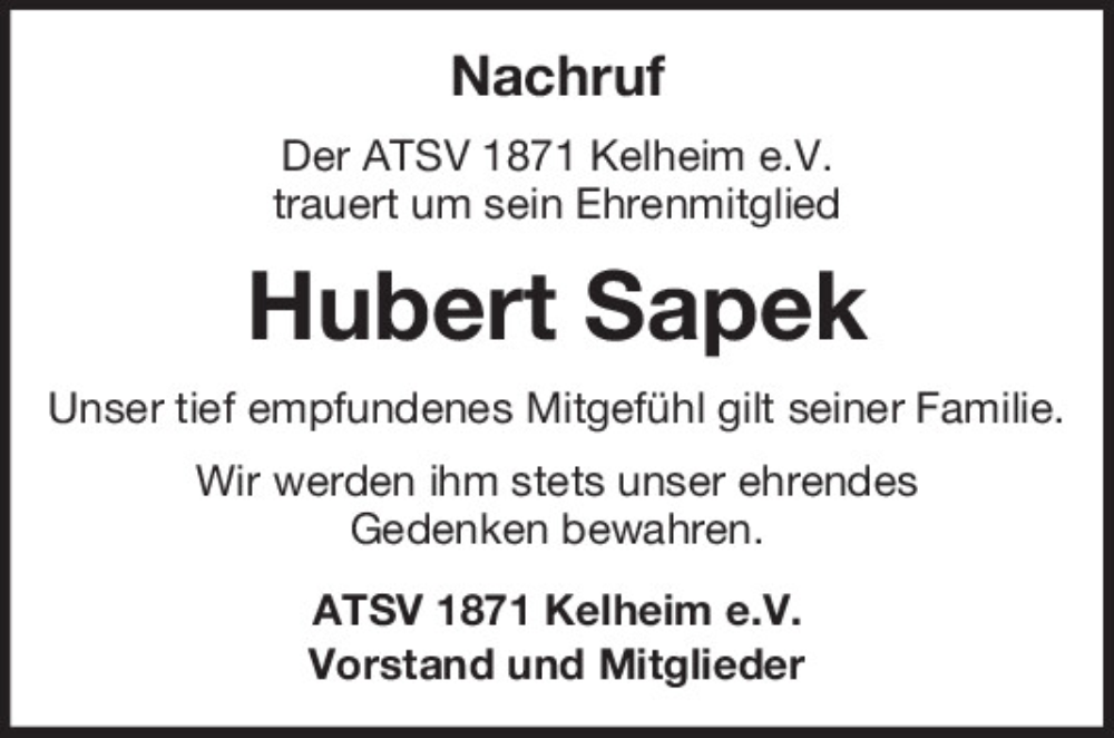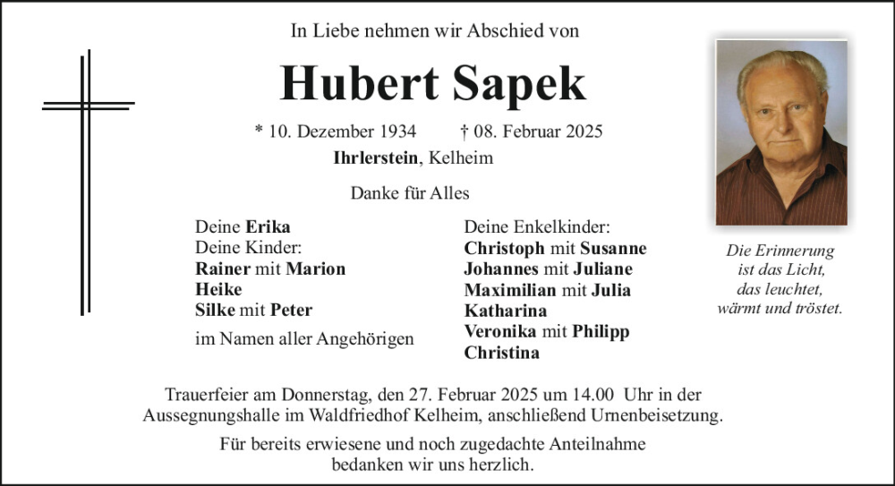 Hier finden Sie alle Traueranzeigen aus der Zeitung, die bisher für Hubert Sapek erschienen sind.
