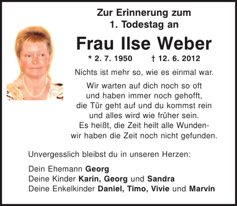 Hier finden Sie alle Traueranzeigen aus der Zeitung, die bisher für Ilse Weber erschienen sind.